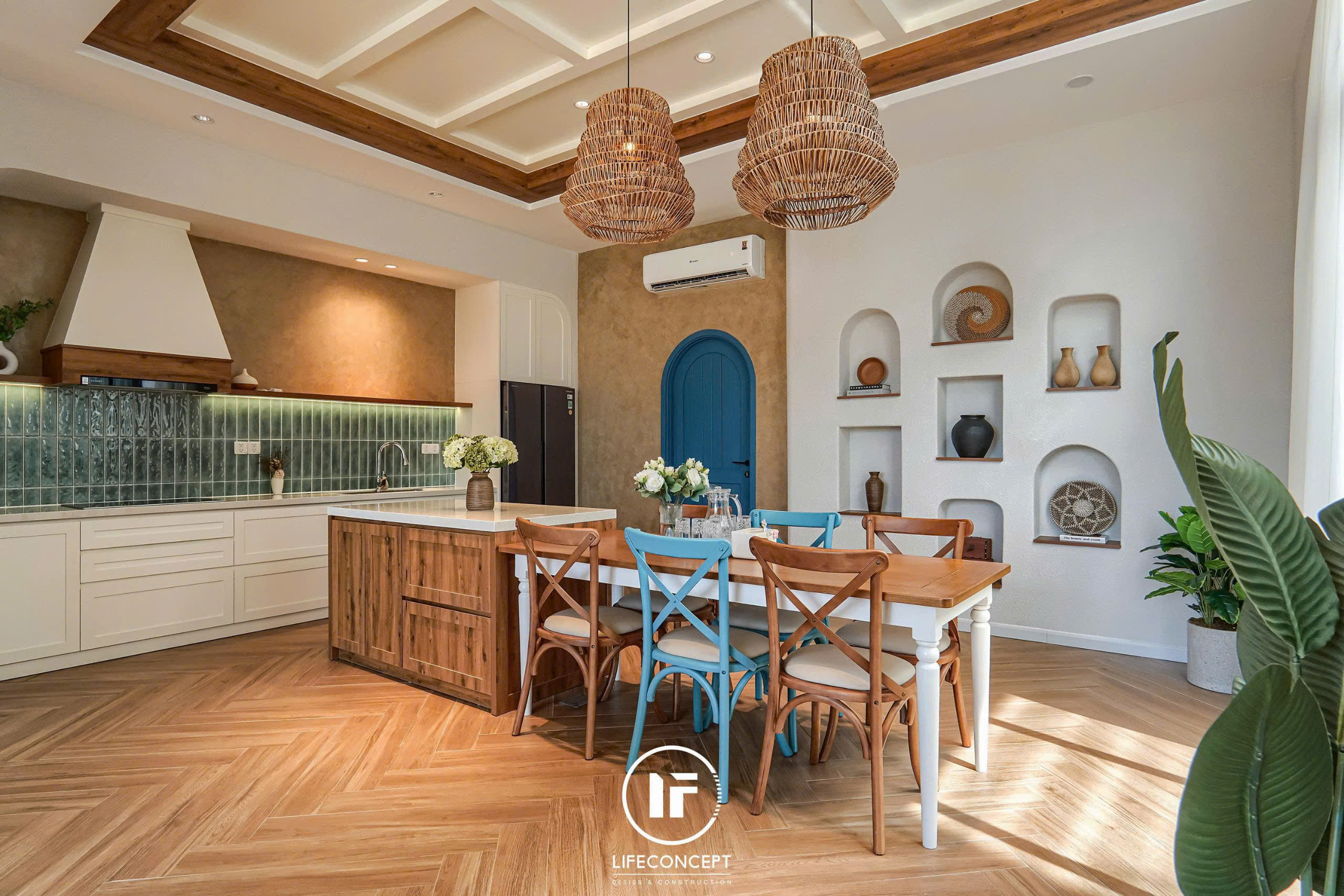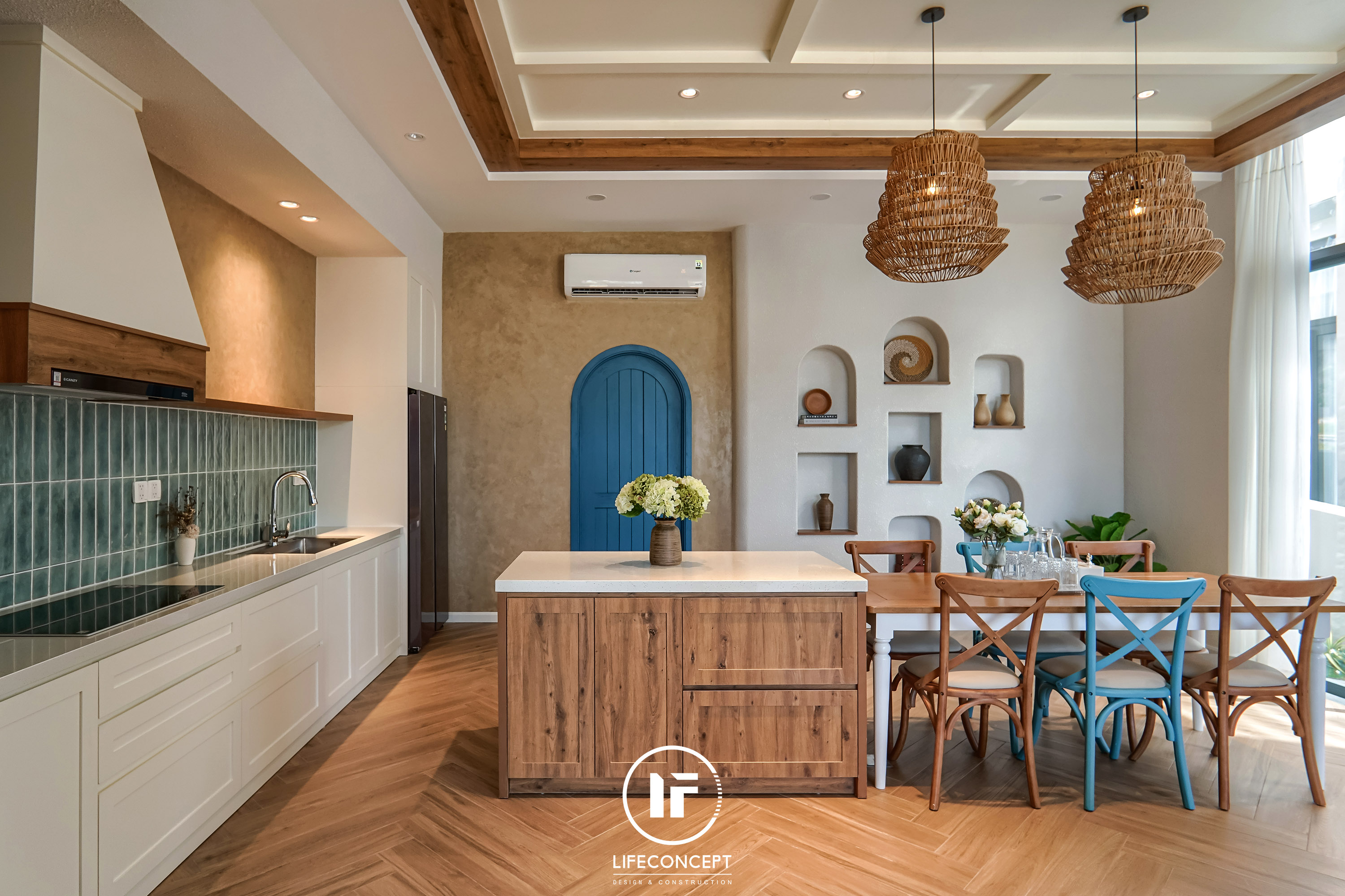 >Ý tưởng thiết kế: Sử dụng phong cách Địa Trung Hải cộng hưởng với sự quý phái của màu sắc, tạo nên 1 ngôn ngữ nội thất rất riêng trong ngôi nhà