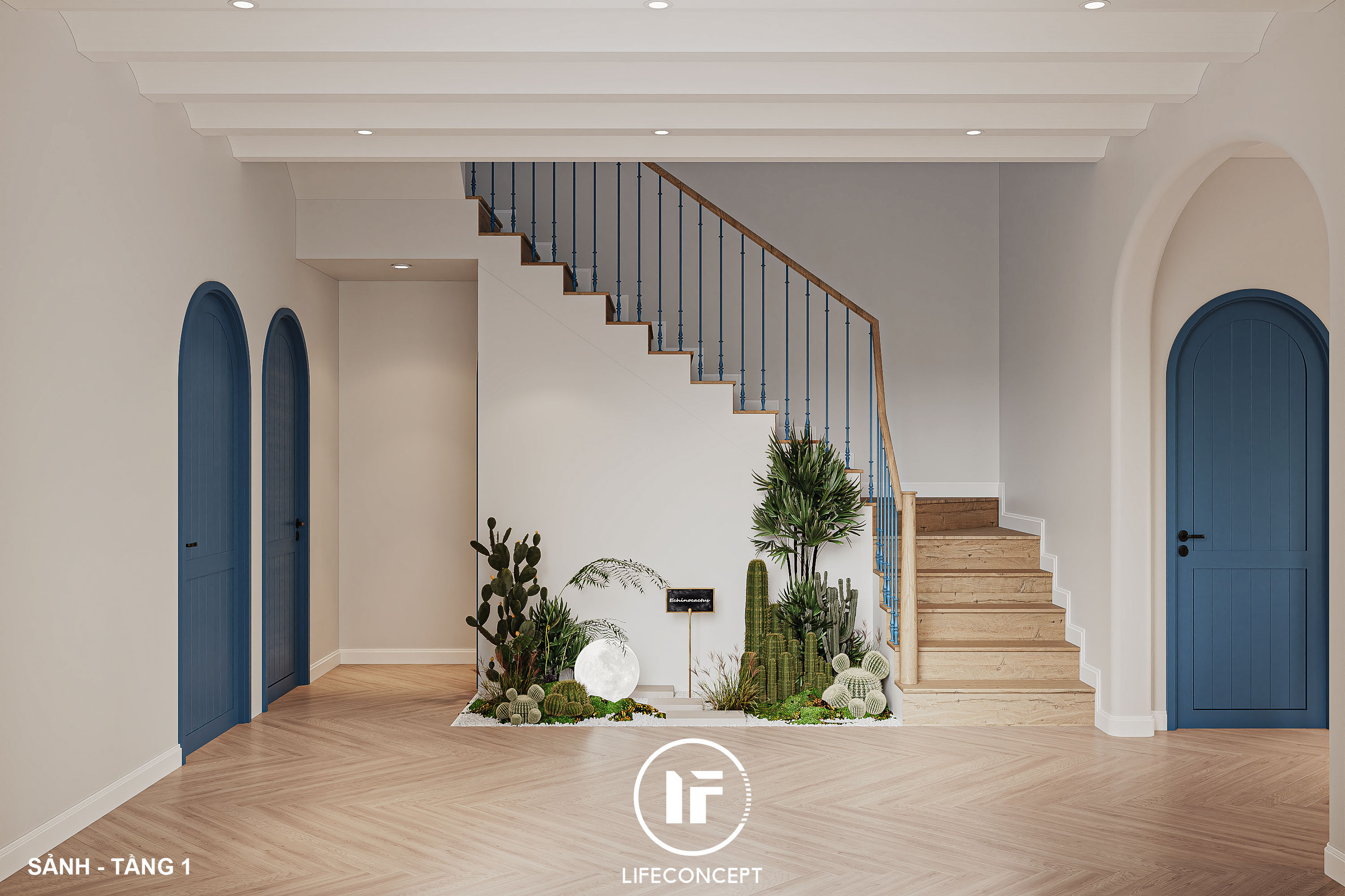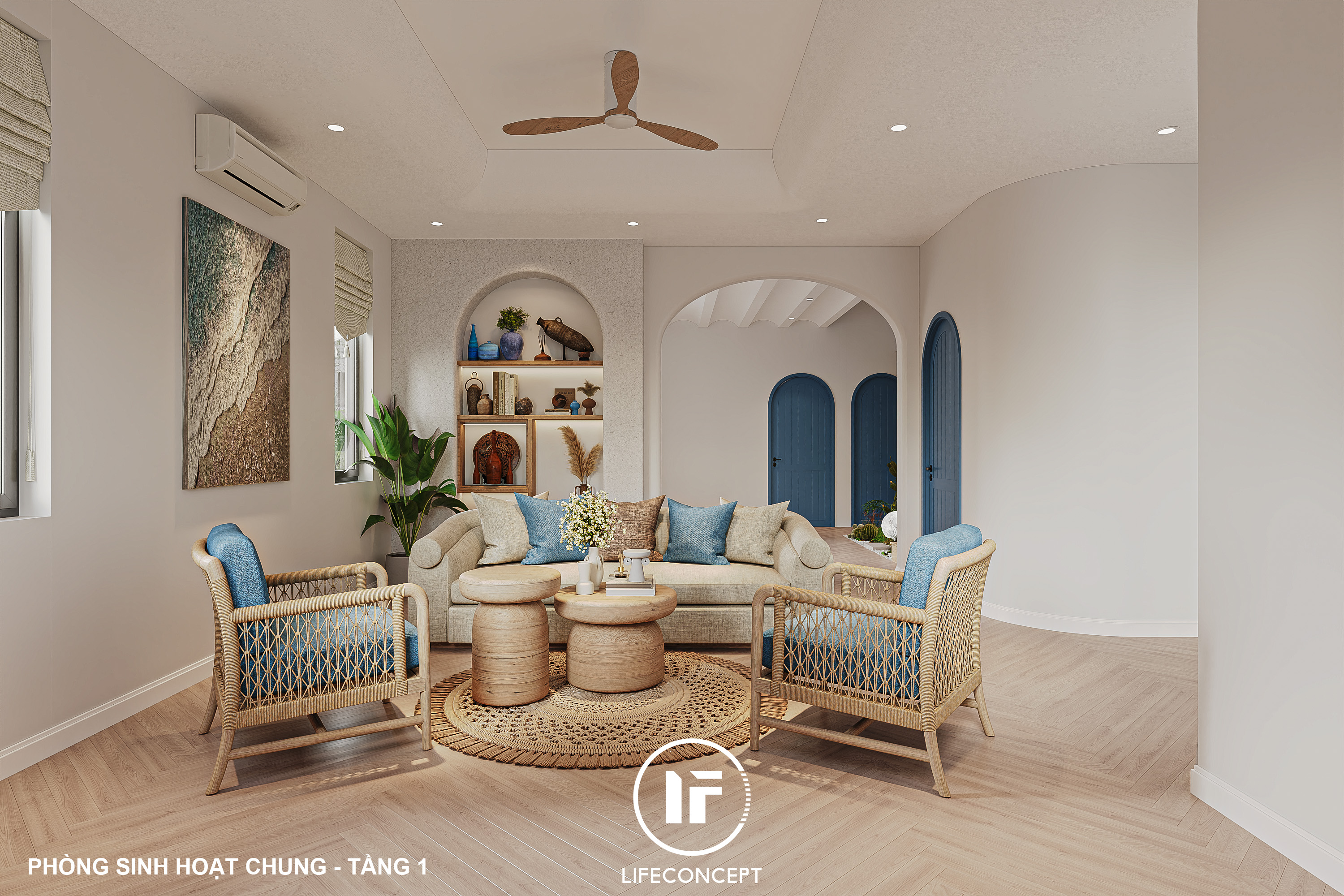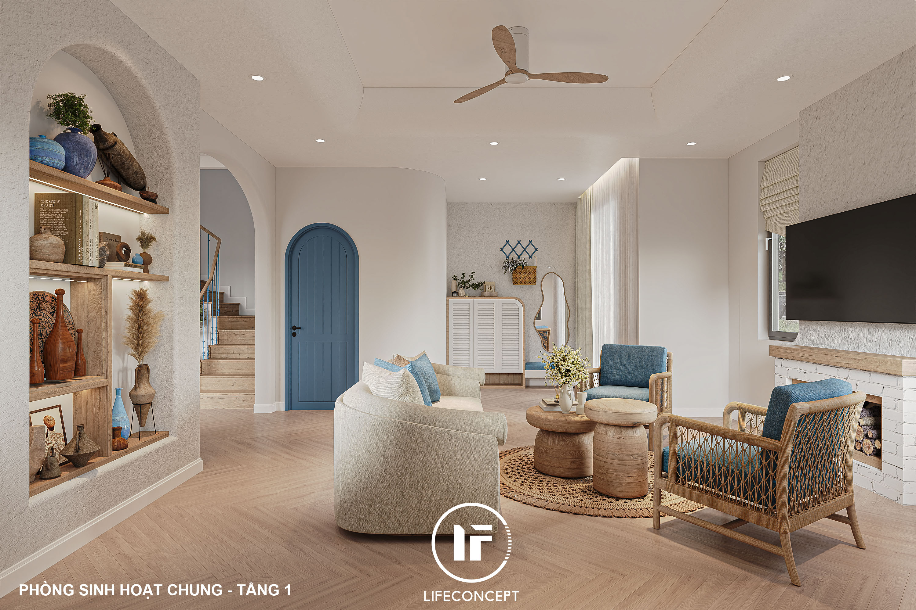 >Ý tưởng thiết kế: Phong cách Santorini hiện đại - Kết hợp tinh tế giữa vẻ đẹp truyền thống của hòn đảo Hy Lạp và những đường nét tối giản, tiện nghi của kiến trúc đương đại