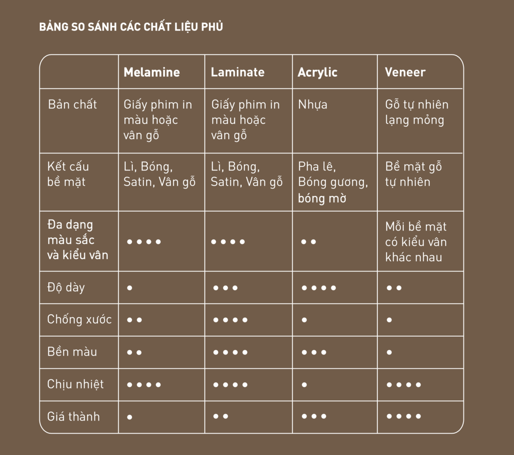 Melamine cho nhu cầu phổ thông, Laminate cho độ bền cao hơn, Acrylic cho không gian cần hiệu ứng bóng hiện đại. Cần thống nhất bề mặt để tổng thể hài hòa.