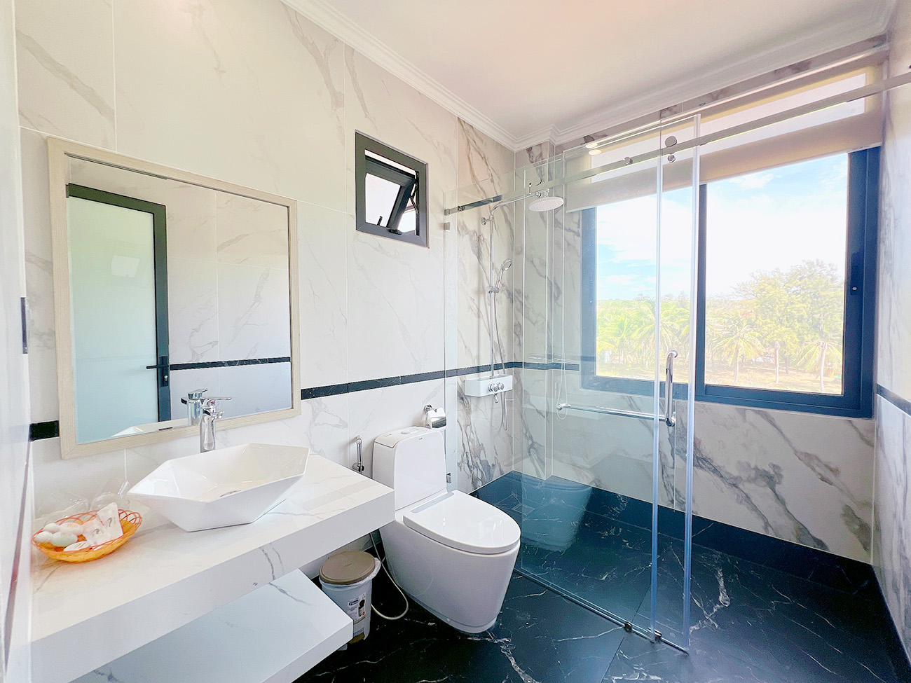 - Khu vực WC: Thiết kế phòng tắm mở với vách kính cường lực giúp không gian không bị bó hẹp.