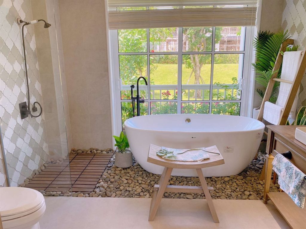 Thiết kế cửa sổ lớn hoặc ô thoáng để đón gió và nắng, giúp phòng tắm luôn khô ráo và mang đậm hơi thở của đại dương.