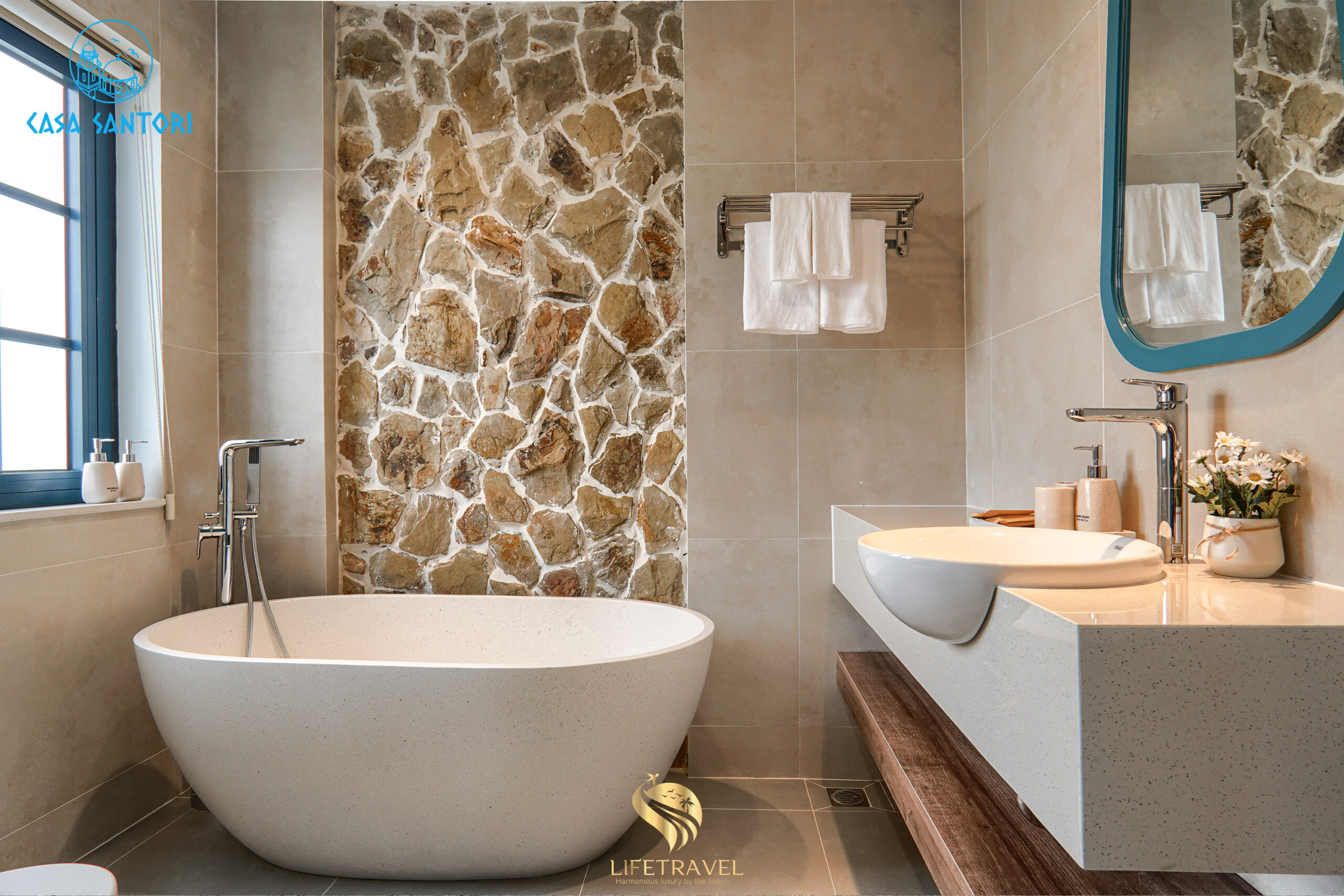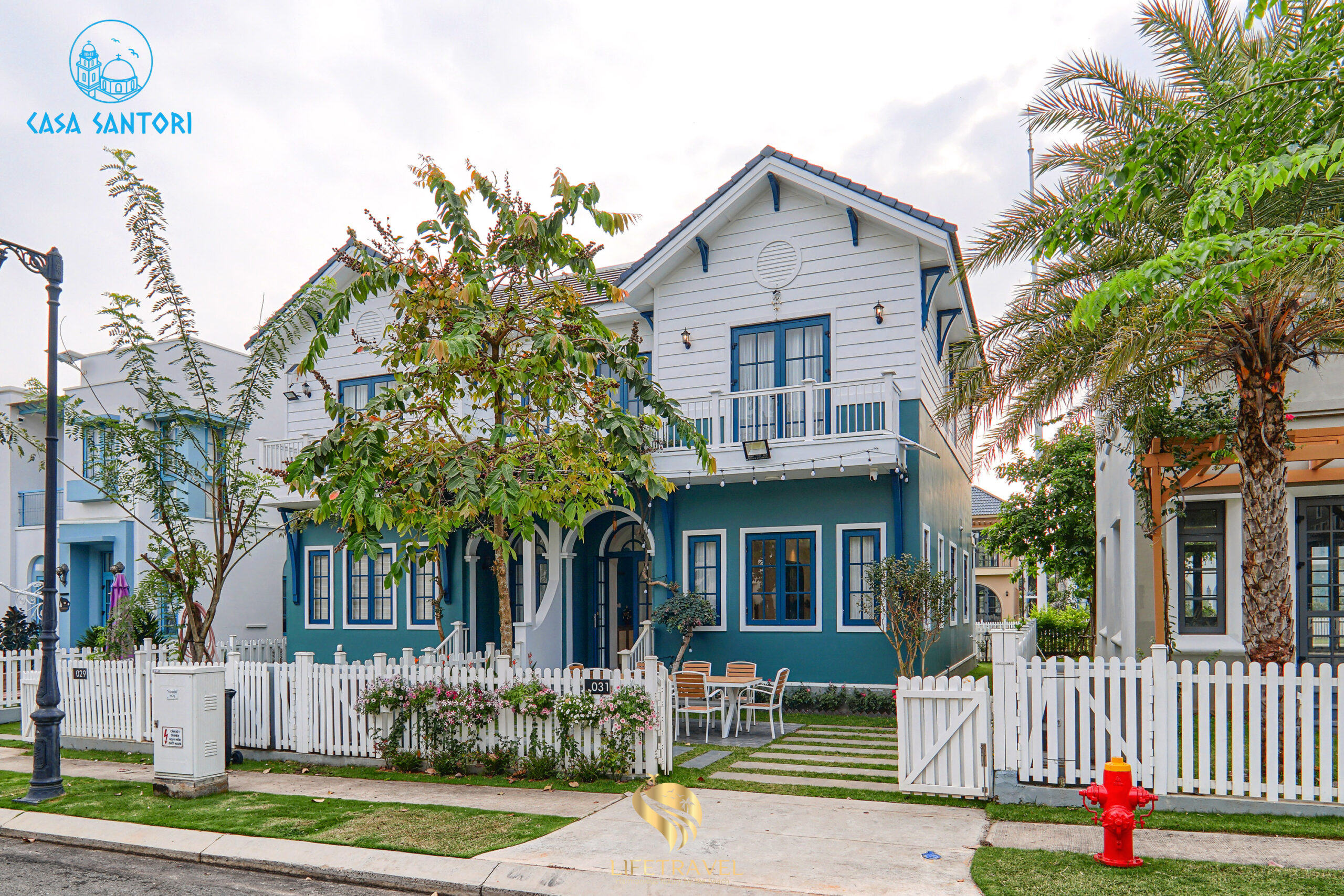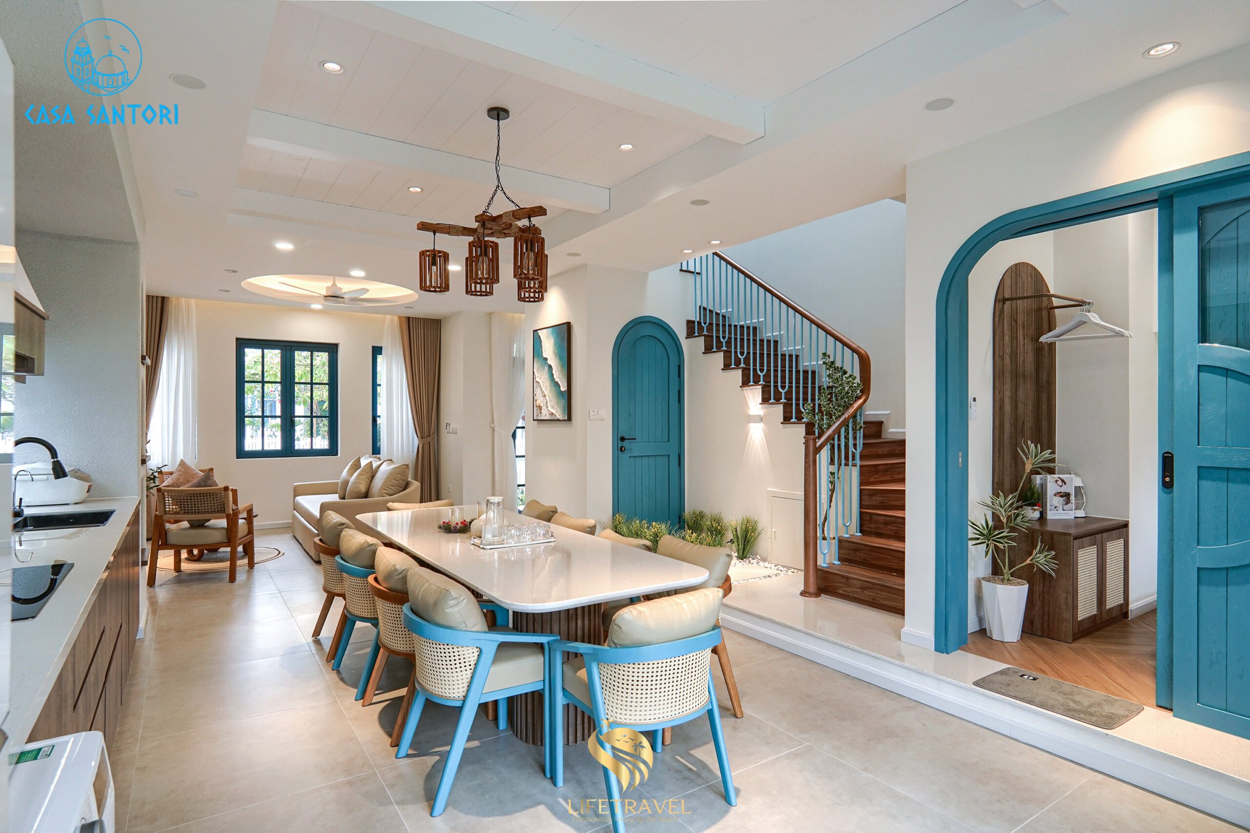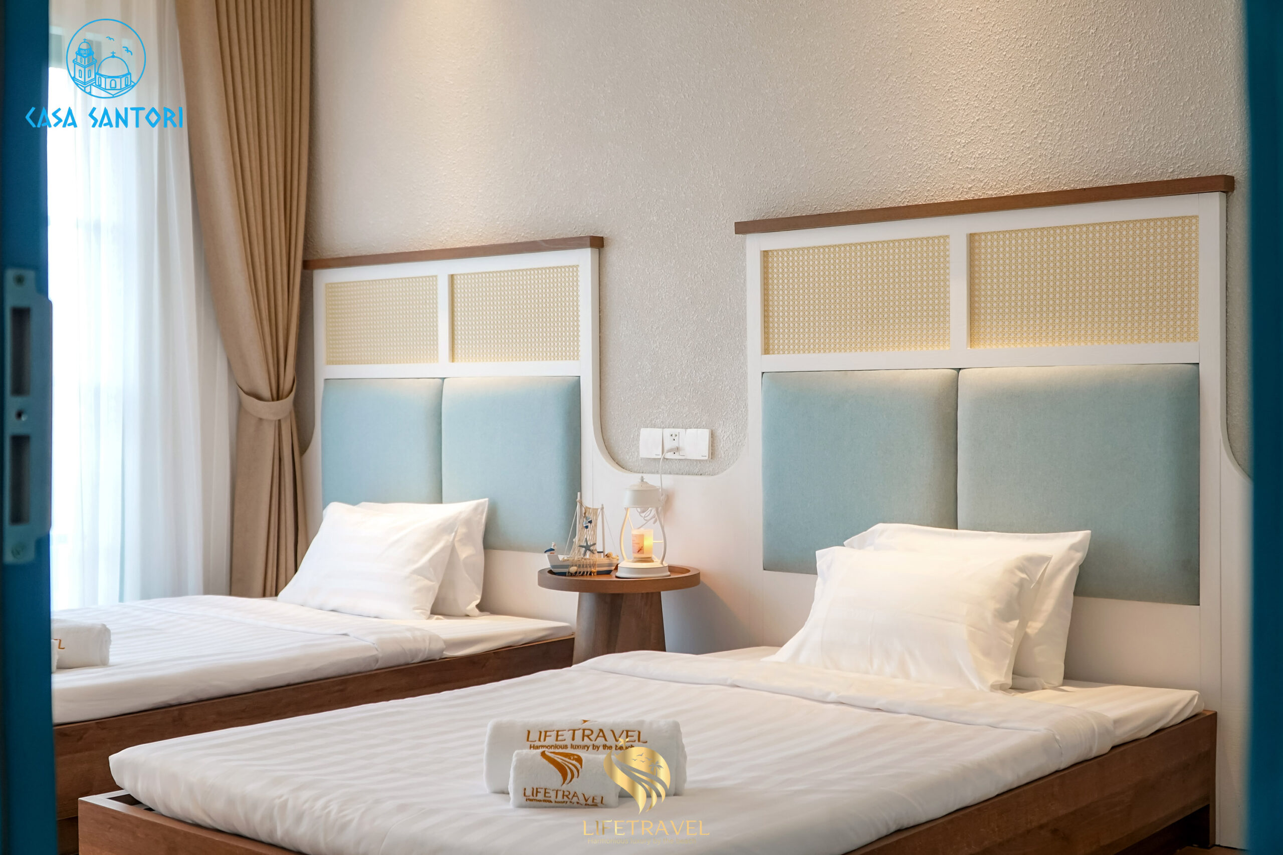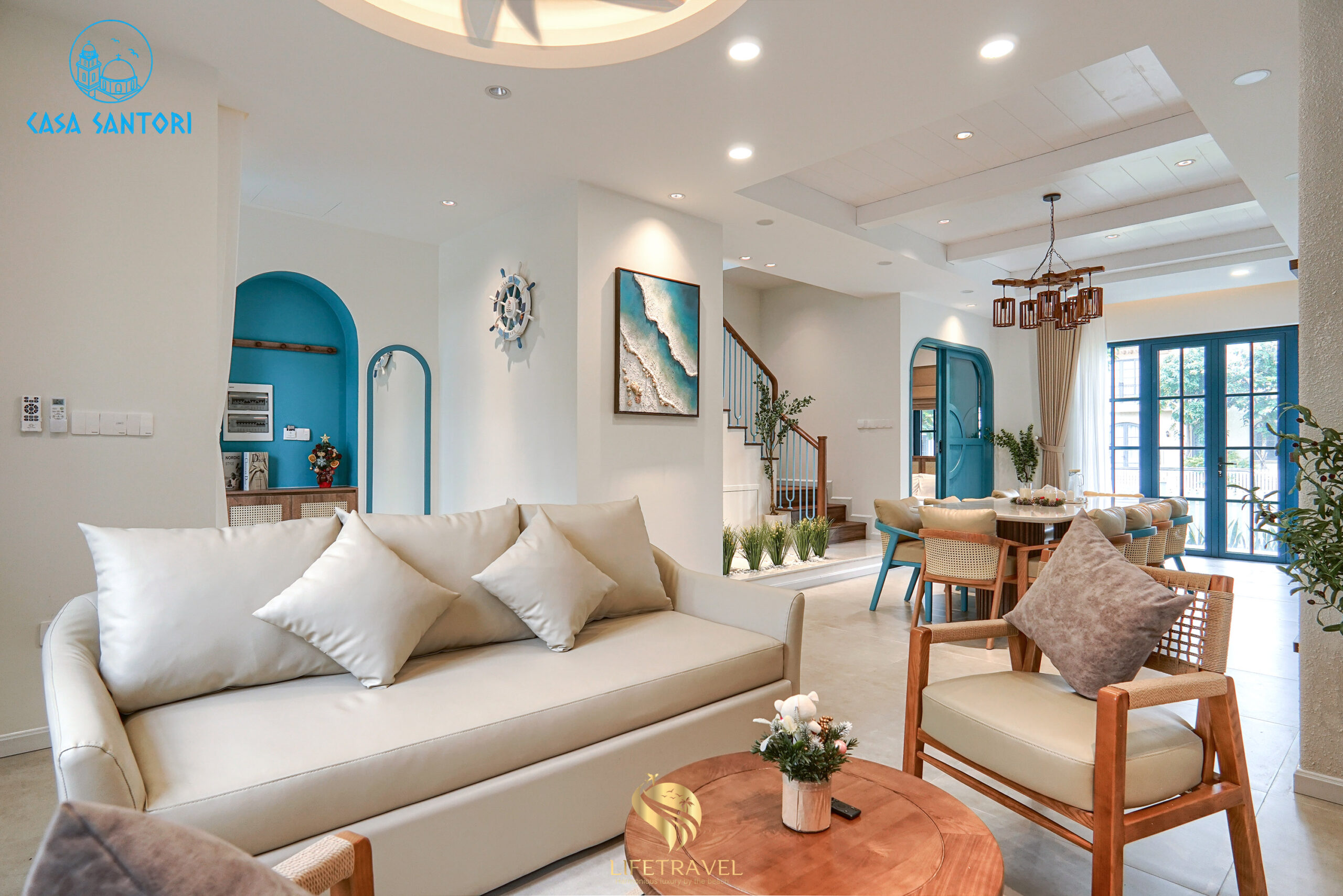 Trong khi đa số resort Mũi Né theo phong cách nhiệt đới, Casa Santori lại nổi bật với tông trắng – xanh Santorini, tạo cảm giác tươi sáng và sang trọng.