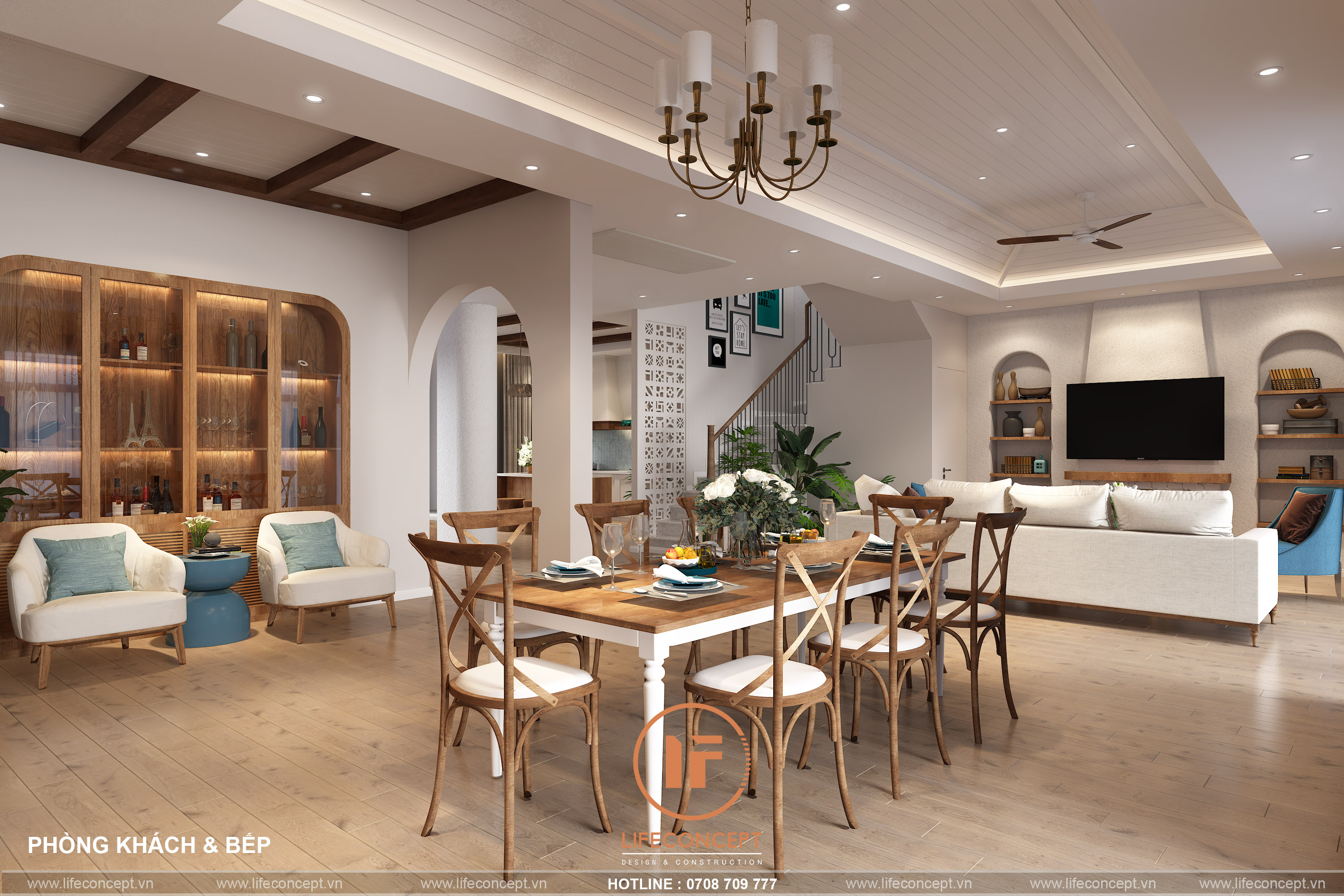 >Ý tưởng thiết kế: Sử dụng phong cách Địa Trung Hải cộng hưởng với sự quý phái của màu sắc, tạo nên 1 ngôn ngữ nội thất rất riêng trong ngôi nhà