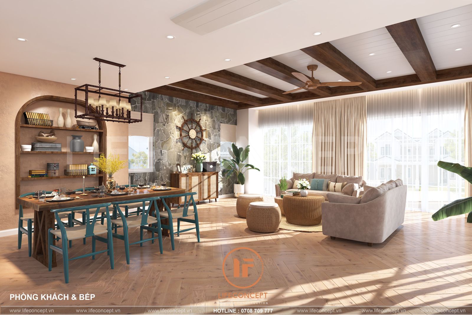 Không gian villa biển 2026 sẽ hướng tới sự mở và tương tác: phòng khách – bếp – sân hiên được kết nối liền mạch. Đồ nội thất có thể linh hoạt chuyển đổi công năng, phục vụ cả sinh hoạt gia đình và hoạt động cho thuê du lịch.