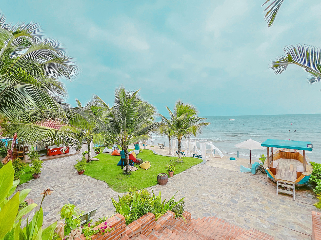 - Khu vực thư giãn: Bố trí ghế lười hoặc sofa chất liệu vải thô chịu được ánh nắng trực tiếp.