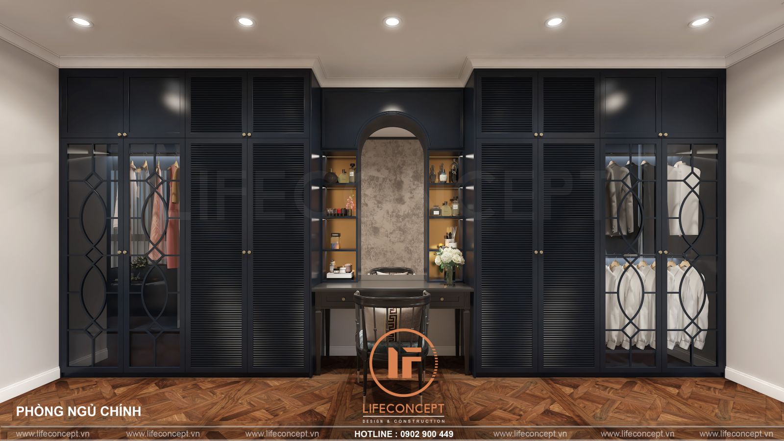 - Phòng ngủ Master: Thiết kế phòng thay đồ riêng biệt (Walk-in closet) với hệ tủ kính sang trọng.